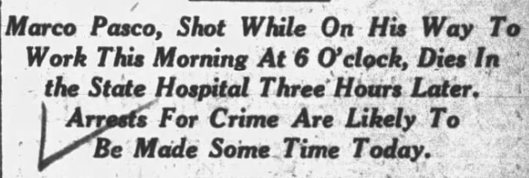 On December 18, 1928, Marco Pasco was shot while walking to work in Scranton, resulting in his death shortly after arrival at the hospital. Known for his violent past, Pasco left behind a large family. Despite police investigations and multiple suspects, his murder remains unsolved to this day.