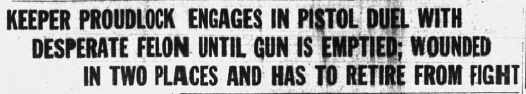 As Delfino was opening the door to the corridor, Josephs started to yell to Proudlock. Proudlock didn’t think much of the disturbance. He came out without his weapon and was met by Delfino and his revolver. The escapee ordered Proudlock through the first iron gate on their way to the main corridor. There, they came upon Steinberg. Delfino now ordered Steinberg to give him the keys to the main corridor. Keeper Steinberg didn’t have them, nor did he know where they were. Delfino then turned to Proudlock and demanded the same.
