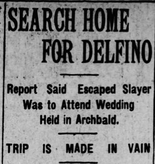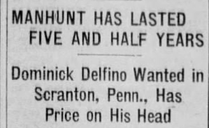 On February 4, 1918, at 3:00 am in the dead of winter, Delfino escaped from the Lackawanna County Jail! He used a saw to cut his way through the bars of his cell. Then he beat jail keeper Thomas Josephs into submission with a wooden leg from a rocking chair. He fired two shots into Robert “Bob” Proudlock, another jailer. Then he held off a third jailer, Isaac “Ike” Steinberg, as he made his escape.