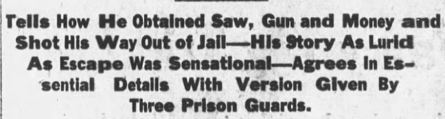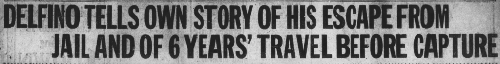 The escape was daring and dramatic. The keepers all put up a valiant fight, but Delfino was on a mission. He extricated himself from the cell through an 8 1/2 x 11 opening in the bars. He then picked up the rocking chair leg. The prisoners used it to stir the soap and water when washing the floors. A cell at the end of the hall was vacant, so he waited there until the keeper came through. As soon as he did, Delfino pounced by striking Josephs in the head. Josephs fought back until Delfino pulled a revolver and demanded the keys.
