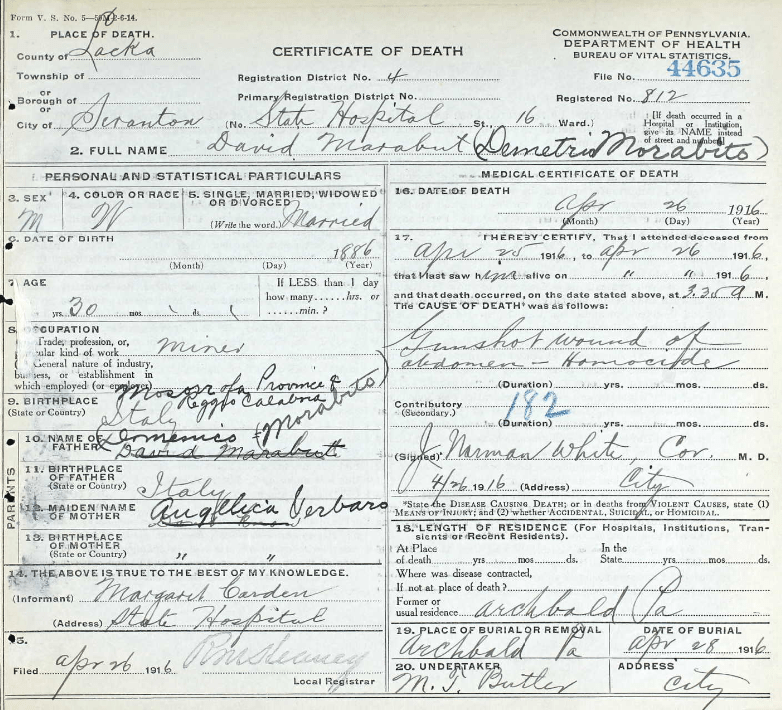 On April 25, 1916, Demetrio “Daniel” Morabito was drinking with several others. The men were at Mellow’s Saloon near the corner of Monroe & Main Street in Archbald. Shortly after 8:00 pm, Morabito left the saloon and headed for home.