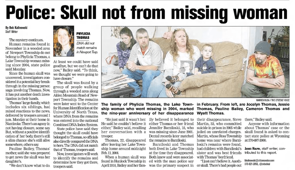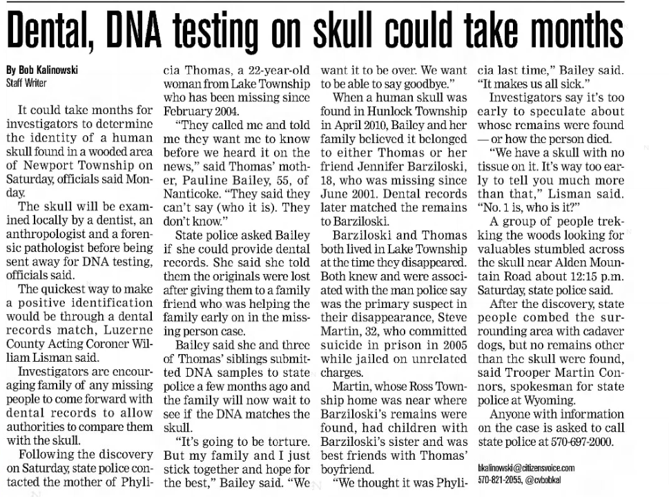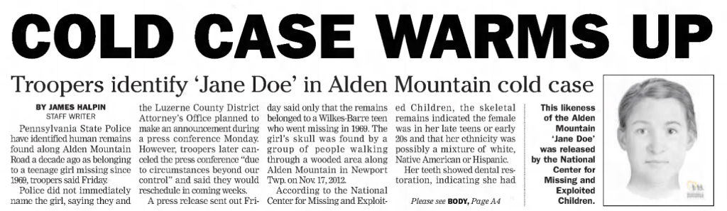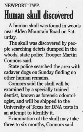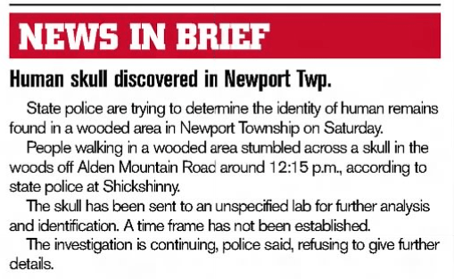 Twelve more years pass. An opportunity to get a break in the case comes. In November 2012, some people were allegedly rummaging through a “trash-filled mine depression” in an abandoned Alden mining area of Nanticoke and made a startling discovery.