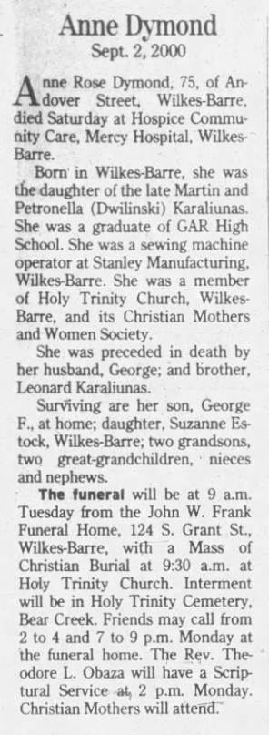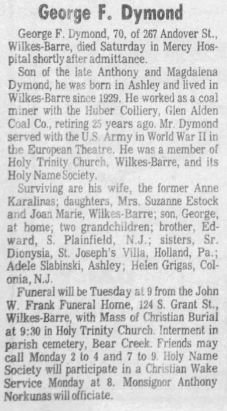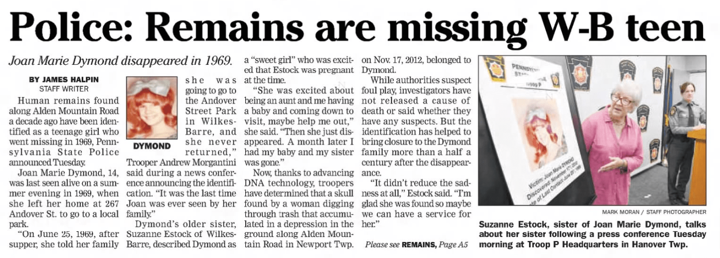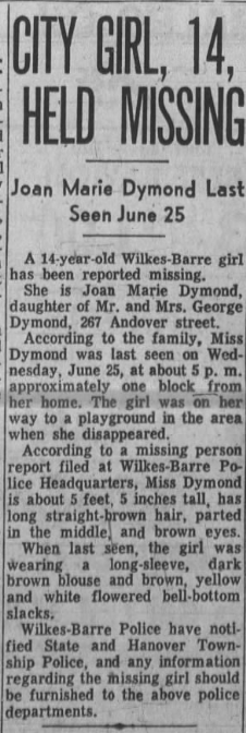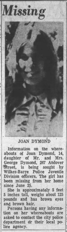 News broke recently that Joan Marie Dymond, a 14-year-old girl from Wilkes-Barre, was murdered in 1969. Joan was the daughter of George and Anne Rose Karaliunis Dymond. She was born in 1953 and lived at 267 Andover St in Wilkes-Barre.