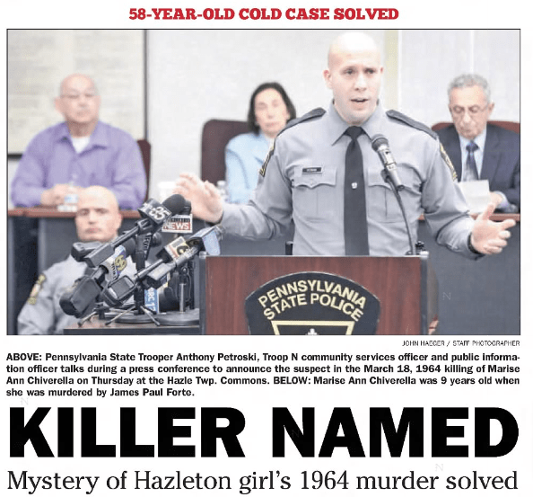 Almost a decade later, in February 2022, Pennsylvania State Police hold a press conference to announce that a 58-year-old Hazleton cold case has been solved with the aid of genetic genealogy performed by 20-year-old Eric Schubert. In this case, 9-year-old Marise Ann Chiverella was murdered at the hands of James Paul Forte in 1964 – five years before Joan went missing. The young girl had been beaten, raped, and strangled with her own shoelaces.