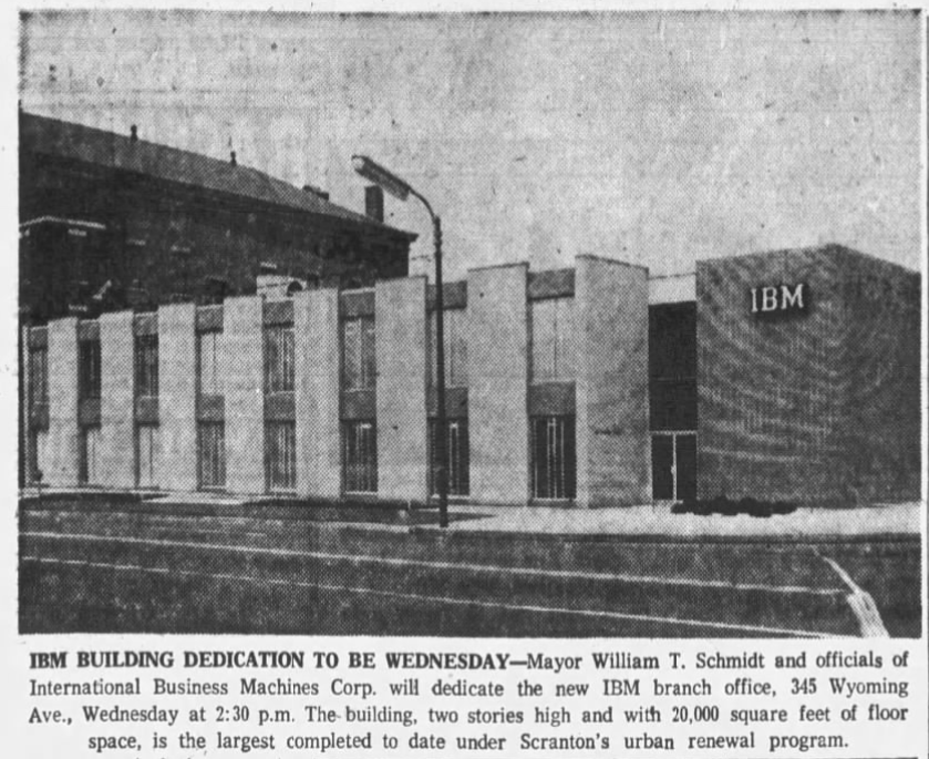 IBM had been in their office on Linden Street since at least 1936 – selling typewriters throughout the region. With the introduction of more mainstream and affordable advanced computers, Scranton became an early adopter of the coming high-tech wave. The new building was evidence of the impending growth and was the pride of the business community.