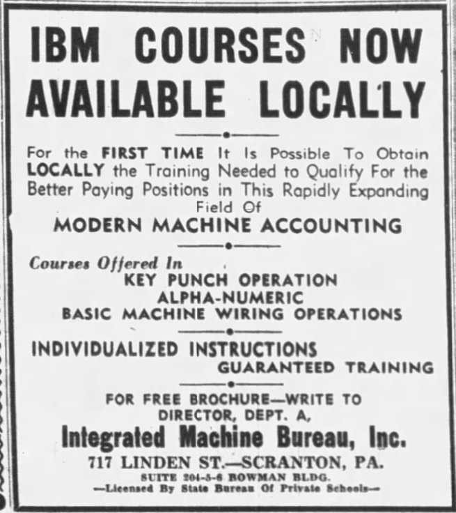 The top floor was available for lease, and it was quickly snapped up by Integrated Machine Bureau (IMB), a private school that focused on providing education on computer operations, such as key-punch operation and programming. Before the move, IMB was located in the same building as IBM, a few short blocks away near the University of Scranton campus.