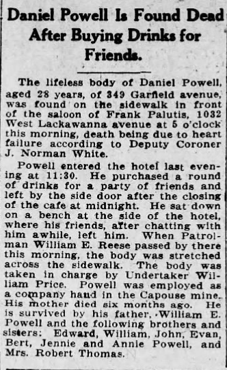 The two men appear to have divested from the “European Restaurant” shortly after the bombing. By 1927, Mira had moved away from Lackawanna Avenue and, by the 1930 census, was listed as a Salesman for “Dry Goods.” Some time after that, Mira opened his Fifth Avenue Linen shop in Pittston – a business he maintained until his retirement in 1959. In 1965, at age 74, Mira was suffering from a long-term illness and tragically took his own life. He was survived by his wife and two children.