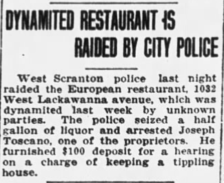 He settled in the Bull’s Head section of Scranton – an area that was notorious for Black Hand activity up until the early 1920s. A barber by trade, Toscano also owned and operated his own barber shop just down the street from their new restaurant.