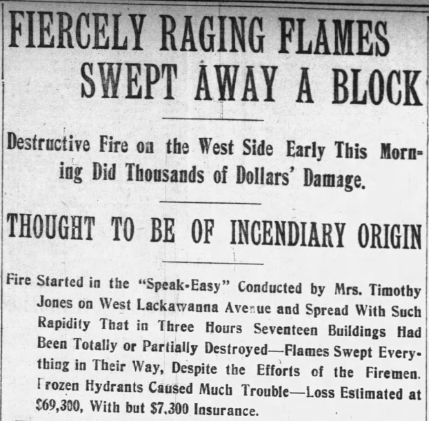 The property sustained damage in a massive fire that hit the entire West Lackawanna Avenue block in February 1899. It was alleged that Mrs. Timothy Jones had set fire to her building after threats from law enforcement to shut down her unlicensed “whiskey shop.”