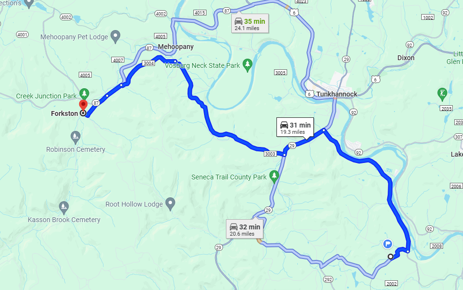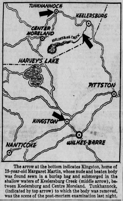 I haven’t been able to find the exact location of the Kerr property, but the town of Forkston sits about 19 miles northwest of where Margaret was found. There was some confusion about the exact location of the mill. In one article, it said it was four miles north of Forkston, and in another gave this description of the location: “100 yards east of a rural road. Running parallel with this road is a high deer fence, also running parallel and to the west, a short distance away, is a trout stream popular with fishermen. The mill is about 700 feet from the Luzerne Rod and Gun Club. The mill is located on the James B. Champlin estate. It is about three miles south of Forkston.”