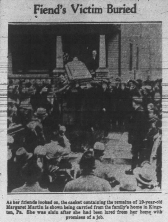 Margaret, the oldest of five siblings, lived in Kingston with her parents, John and Agnes, and the rest of her family. John Martin was a coal miner and leader of the Democratic Party in Luzerne County. Agnes, his wife, was a stay-at-home wife, raising their children. They lived in a modest home located at 43 Covert Street in Kingston, just a short block from the bustling business district along Wyoming Avenue in an area known as Kingston Corners.
