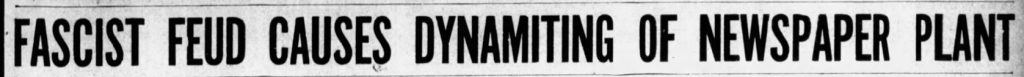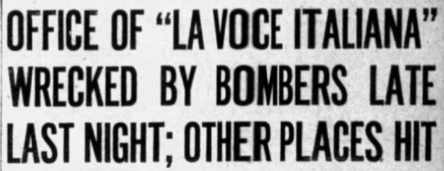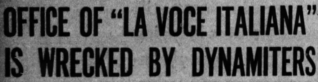 Just before midnight on April 20, 1928, another explosion rocked the building that housed La Voce Italiana, the new Fascist newspaper in town. The blast was so strong that it affected several other nearby buildings. This was now reported as the fifth dynamiting in the city since the beginning of the year.