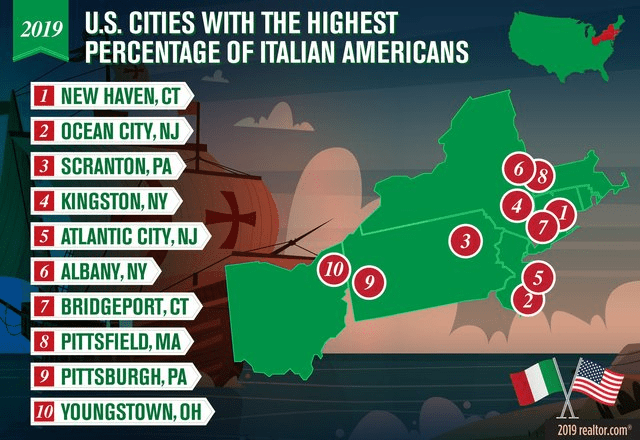 At the time, Scranton was also home to tens of thousands of Italian immigrants. Large pockets of Italians could be found around the city in places like Bulls Head, West Scranton, and South Scranton. Elsewhere in Lackawanna County, places like Jessup, Carbondale, Dunmore, Pittston, and Old Forge also had large populations of Italians. Even as late as 2019, Scranton was listed as #3 in the percentage of Italian-Americans – based on a survey from Realtor.com.