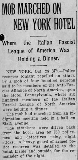 Tensions between the two sides escalated over the years. Anti-fascist members were protesting their counterparts around the country – like at this dinner in New York City when an angry mob of anti-fascists disrupted an Italian Fascist League dinner party.