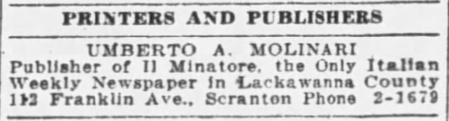 Il Minatore, translated to “The Miner,” was published across Center St from La Voce. Its origins date back to March 1911. Umberto Molinari, an Italian immigrant to the US from the Northern Italian comune of Cremona in Lombardy, joined the newspaper early on as its editor. He would later purchase the paper. The newspaper was against Mussolini and supported the Italian-American Anti-Fascist Association.