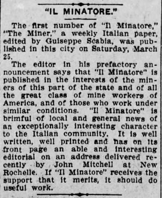 In fact, there were so many Italians in Lackawanna County that at least two Italian-language newspapers were operating in Scranton. Il Minatore, aka, “The Miner,” started publication in March 1911. It was later joined by La Voce Italiana, aka, “The Italian Voice,” which started in December 1927. More on that later.