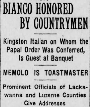 Bianco was a prominent man in the business community. He was a banker and a candy maker in Pittston. He was also a leader in the Sons of Italy and Fascist League of North America organizations, having been awarded commendations by Pope Pius XII and Italian King, Vittorio Emmanuel. He was also reported to be a close personal friend of Mussolini.