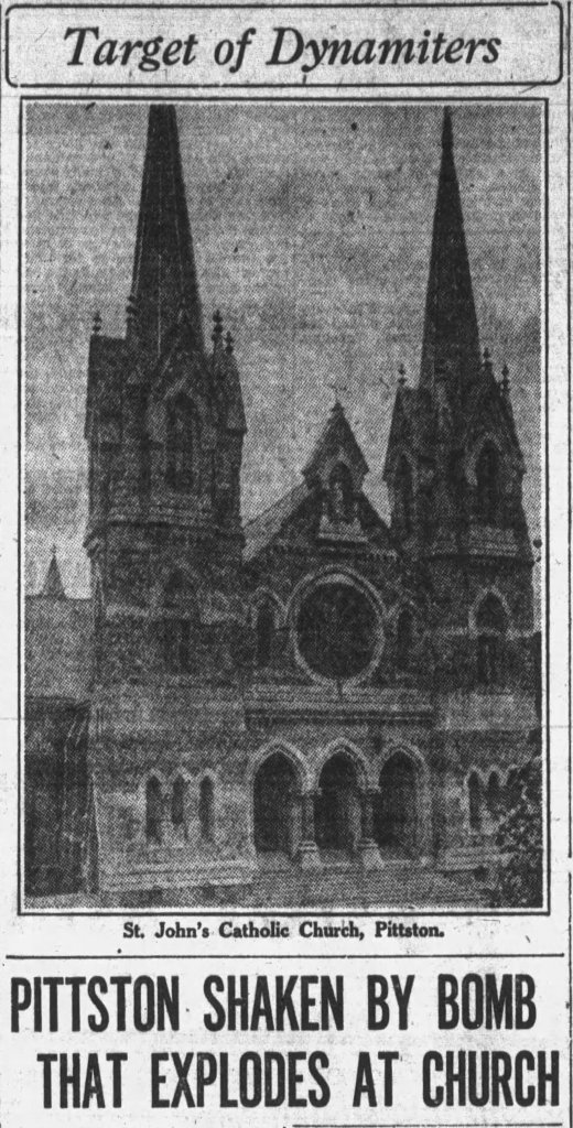The candy factory blast was followed by yet another bombing just two weeks later. This time at St. John’s Catholic Church in Pittston. It was reportedly in response to the Mayor offering a reward for information leading to the arrest of those responsible for bombing the Bianco business. This marked the fourth attack in a matter of weeks within Pittston – and several others in Lackawanna County.