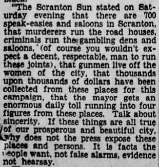 A year after opening, in September 1927, they printed an “expose” on crime in Lackawanna and Luzerne counties. The paper claimed that bootlegging, gambling, and white slavery (prostitution) were ubiquitous throughout the two counties. They claimed that over 700 speakeasies and saloons were operating in Scranton at that time.