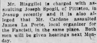 The violence reached Lackawanna County by August 1926. Luigi Biaggioli, Enrico Monacelli, and Benvenuto “Lullo” Cardone, all members of the Anti-Fascist Party were accused of assaulting members of the rival Fascist party.