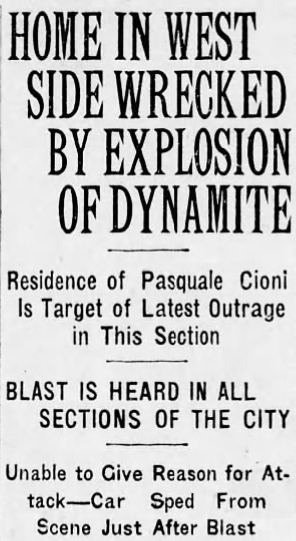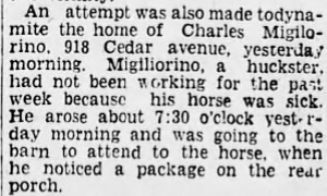 While investigators tracked down other leads for the Sun bombing, the violence didn’t stop. Several other attacks occurred throughout the city in the early months of 1928. The homes of Pasquale Cioni, 206 Chestnut Ave (Now St. Frances Cabrini), and Charles Migliorino, 918 Cedar Ave were both targeted on the same evening in March 1928.