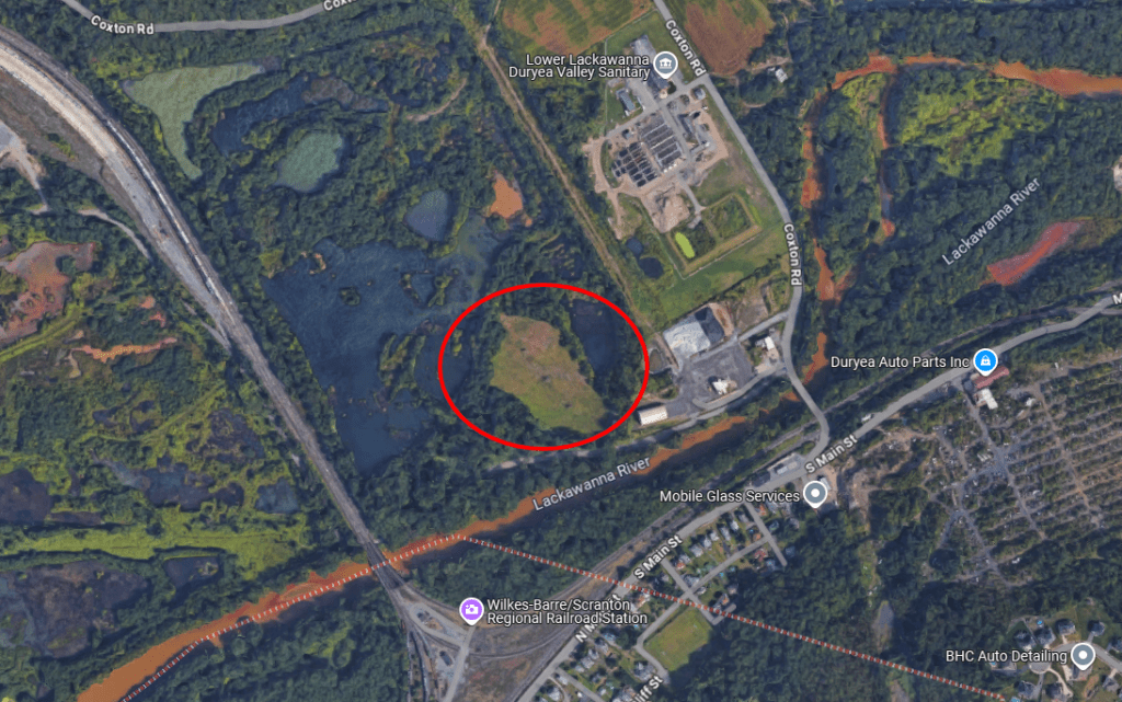 The location was described as: About 200 yards off of Coxton Road, near the railyard. It was about 150 yards behind the water treatment plant, close to a sand and gravel pit. It was 300 feet from the Conrail Road that leads to the yard. It was under the radio transmitters.