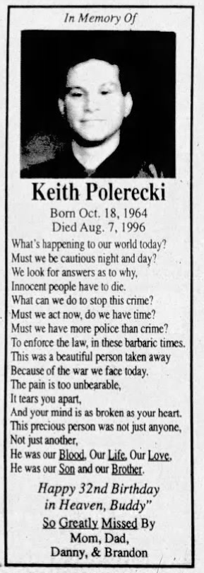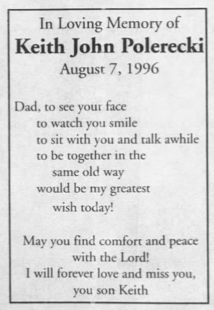 Days, weeks, and months pass with no new leads in the Polerecki case. The family placed this memorial to Keith on his first birthday, away from this earth.
