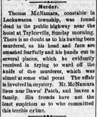 Just two months later, on November 16, 1872, Constable Thomas McNamara was found dead on Main Avenue in Taylor. He appeared to have been beaten and slashed with a knife. To the best of my knowledge, the killer was never found.