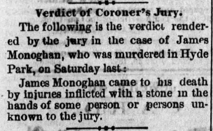 The inquest continued the following day, and on October 3, 1872, it was surmised that James Monaghan had been murdered.