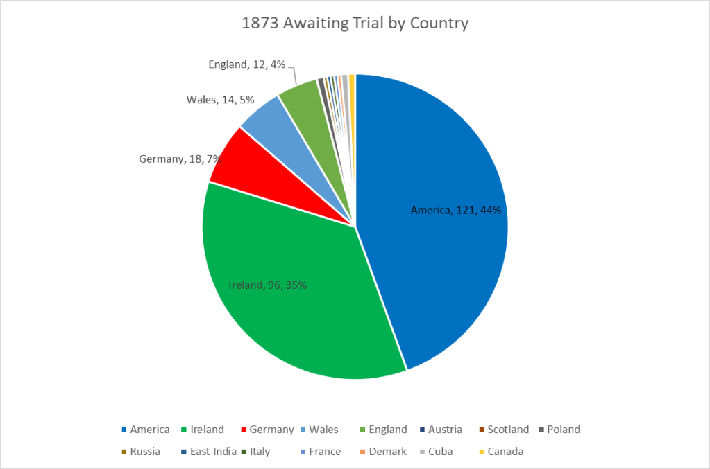 For those awaiting trial, it was definitely a more diverse crowd. Still, Americans led, but the Irish were next to the early settlers.