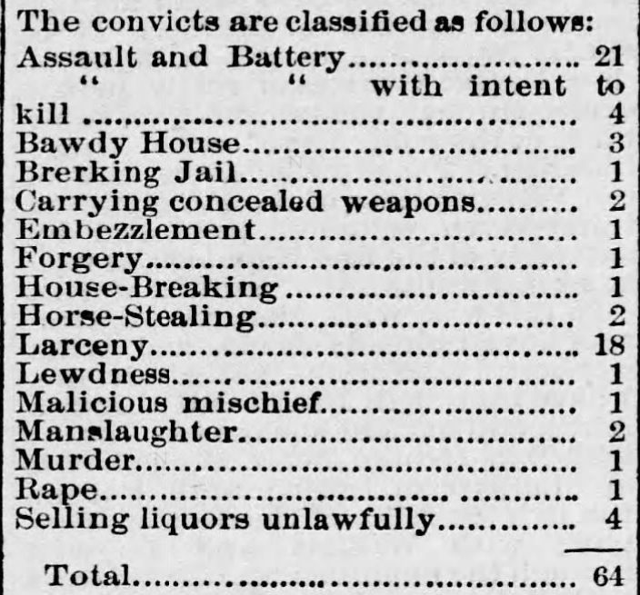At that time, there were only 64 people actually in prison in the county. The majority for Assault and Battery, with Larceny a close second.