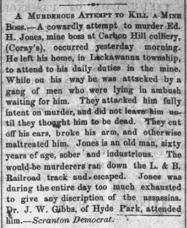 Then, on the same day that the news broke of Monaghan’s death, reports of a shooting in Spring Brook hit the papers. It was reported that men, allegedly belonging to the Molly Maguires, waited for a man at the Lackawanna Train Station. When the unsuspecting man exited the train, the men asked him to join the organization or face the punishment that Ed Jones received.