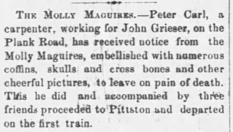 In yet another instance from November 13, 1872, just months after the Monaghan murder, the Mollys left a threatening note for another carpenter, this time in Wilkes-Barre. They forced him to leave the area under threat of death.